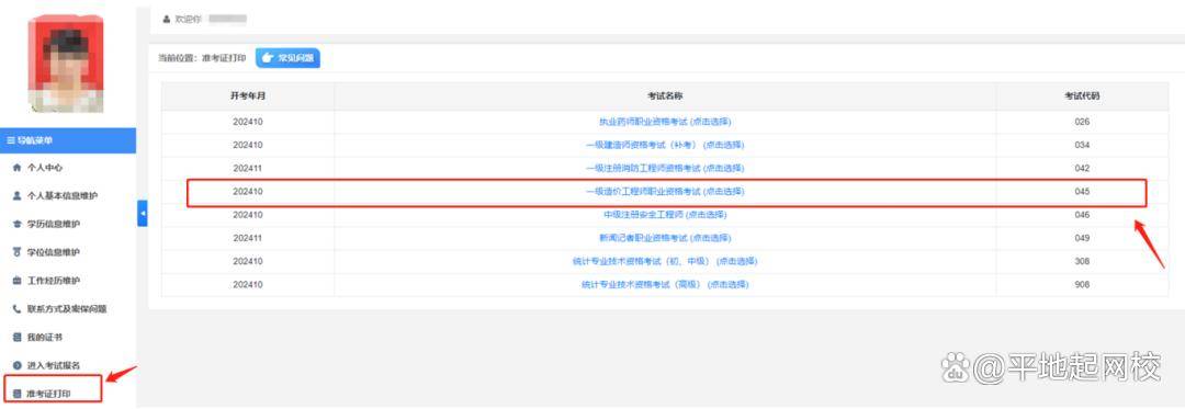 三、点击左边菜单栏准考证打印,选择【2025一级造价工程师职业资格考试】