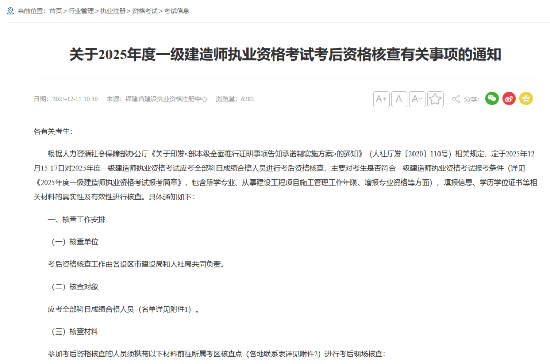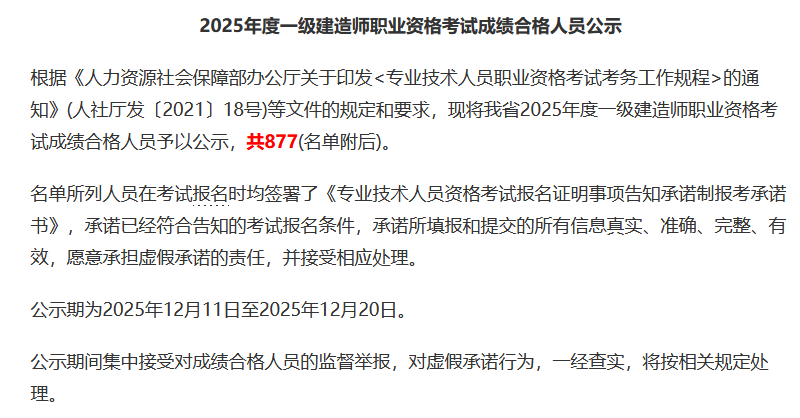 12月11日,福建省人力资源和社会保障厅发布2025年一级建造师考试合格人员公示名单(见附件1),全省共4143人合格。相比去年全省合格人数上涨1.82%,增加74人。公告原文截图如下: