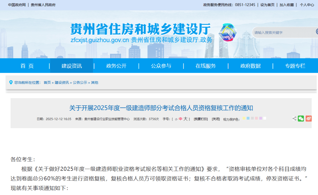 12月12日,贵州省住房和城乡建设厅发布2025年一级建造师考试合格人员公示名单,全省共1686人合格。相比去年全省合格人数下降1.86%,减少32人。公告原文截图如下: