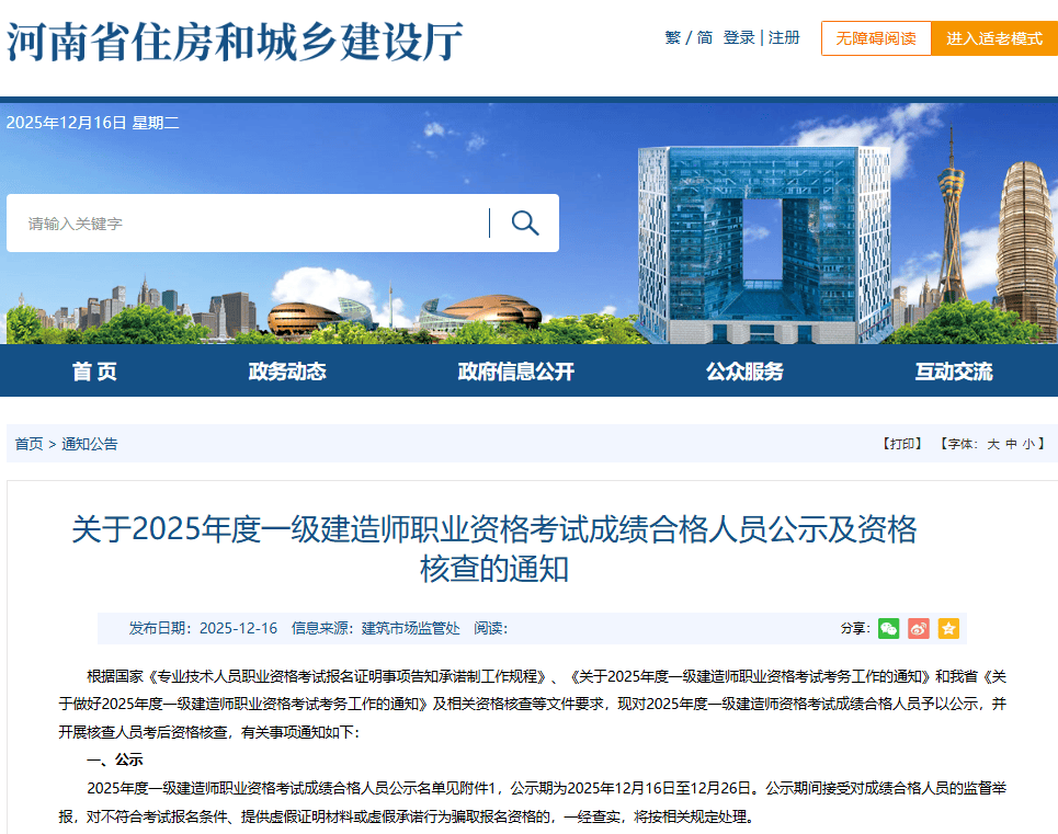 12月16日,河南人事考试网发布2025年一级建造师考试合格人员公示名单(见上方二维码),全省共13592人合格。相比去年全省合格人数上涨14.25%,增加1696人。公告截图原文如下: