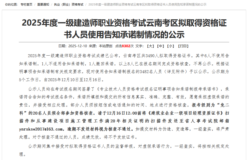 12月10日,云南人力资源和社会保障网发布2025年一级建造师考试合格人员公示名单,全省共3490人合格。相比去年全省合格人数下降0.26%,减少9人。公告原文截图如下: