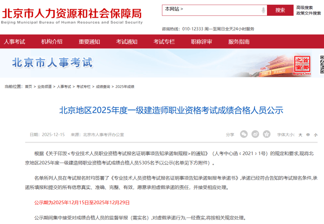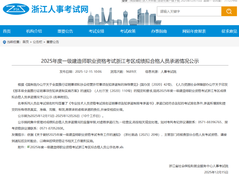 12月15日,浙江人事考试网发布2025年一级建造师考试合格人员公示名单(见上方二维码),全省共5305人合格。相比去年全省合格人数上涨4.76%,增加241人。公告截图原文如下: