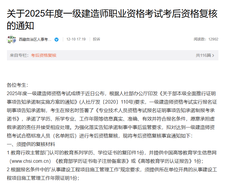 12月12日,西藏人事考试网发布2025年一级建造师考试合格人员公示名单(见附件1),全省共252人合格。相比去年全省合格人数上涨9.09%,增加21人。公告原文截图如下: