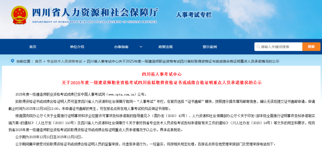 12月11日,四川省人力资源和社会保障厅发布2025年一级建造师考试合格人员公示名单(见附件1),全省共10421人合格。相比去年全省合格人数上涨2.80%,增加287人。公告原文截图如下: