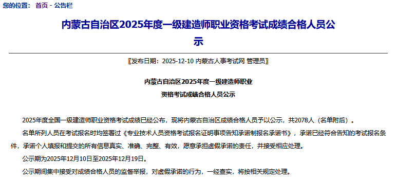 12月10日,内蒙古人事考试网发布2025年一级建造师考试合格人员公示名单,全省共2078人合格。相比去年全省合格人数上涨22.38%,增加380人。公告原文截图如下: