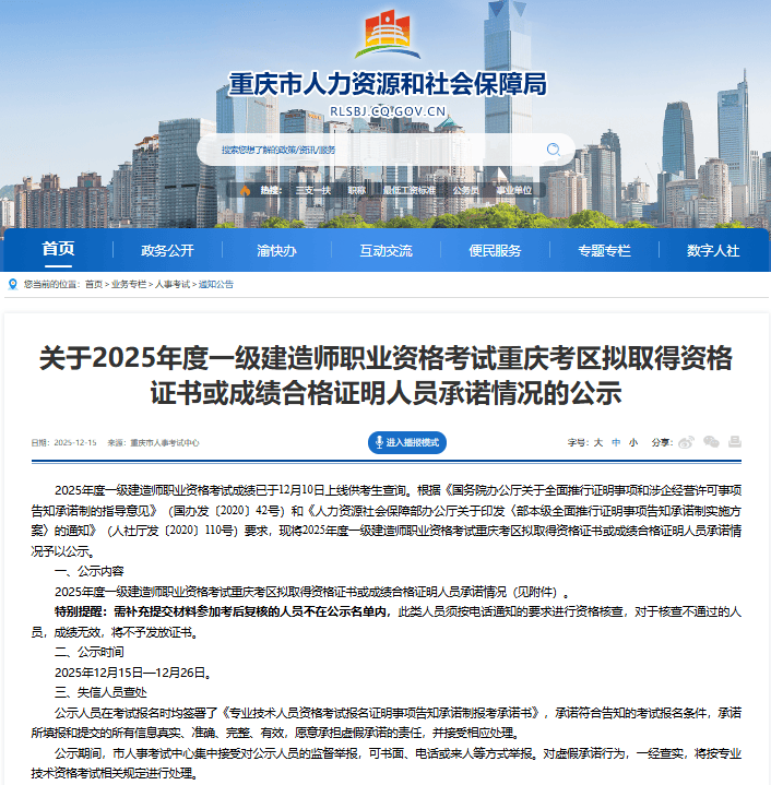 12月15日,重庆市人力资源和社会保障局发布2025年一级建造师考试合格人员公示名单(见上方二维码),全省共4109人合格。相比去年全省合格人数上涨2.37%,增加95人。公告截图原文如下: