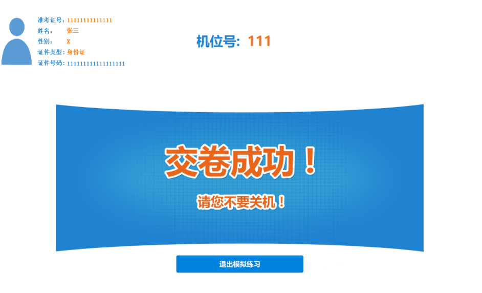 提交模拟:完成练习后退出系统即可(模拟成绩不影响正式考试)。