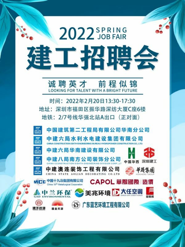 本次招聘会参与单位:中国建筑第二工程局有限公司华南分公司、中建六局水利水电建设集团有限公司、中建六局华南建设有限公司、中建八局南方公司装饰分公司、中国华西、深圳建工、中建澳连装饰工程有限公司、华晟集团等数十家名企。